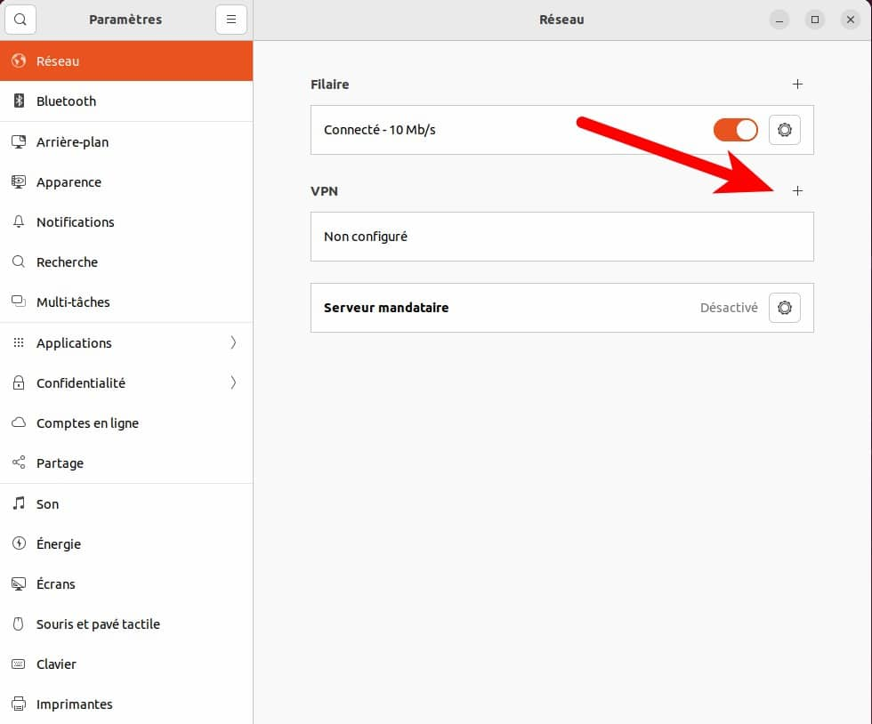 Pour les versions Ubuntu, Mint et Debian récentes cliquez sur le menu réseau, le + sur la partie VPN :
